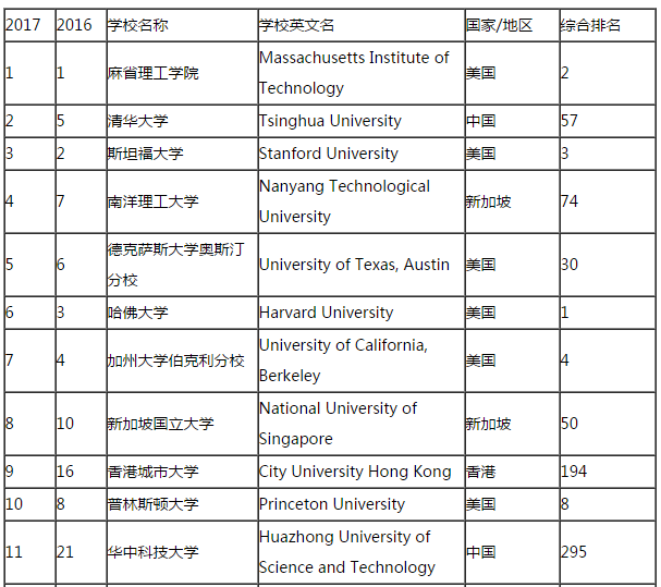 從近兩年排名中對(duì)比分析可以看出,麻省理工學(xué)院連續(xù)兩年位列第一名,在工科的實(shí)力上一致處于世界領(lǐng)先水平。本次清華大學(xué)也是非常出色,位列第二名,較16年上升3名,斯坦福大學(xué)下降已經(jīng)位列第三。