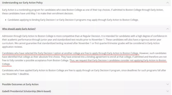 波士頓學(xué)院官網(wǎng)上最后又特別強(qiáng)調(diào):強(qiáng)烈請(qǐng)求各位申請(qǐng)其他學(xué)校ED1的申請(qǐng)者不要申請(qǐng)波士頓學(xué)院的EA。但是從整體政策的規(guī)定上講,EA不屬于限制性申請(qǐng),所以申請(qǐng)其他ED可以同時(shí)申請(qǐng)波士頓學(xué)院的EA。