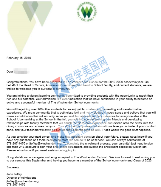 溫徹頓中學(xué)The winchedon school錄取offer展示: