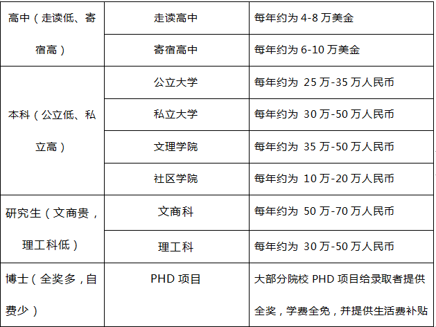 按照不同的入讀層次,整體費用如下: