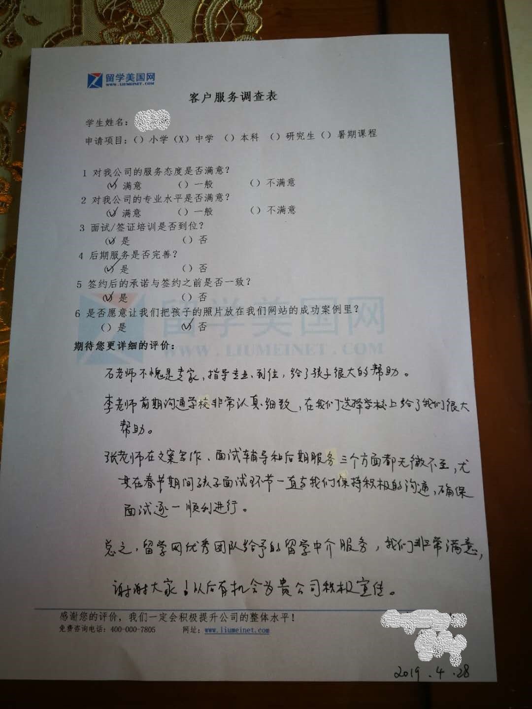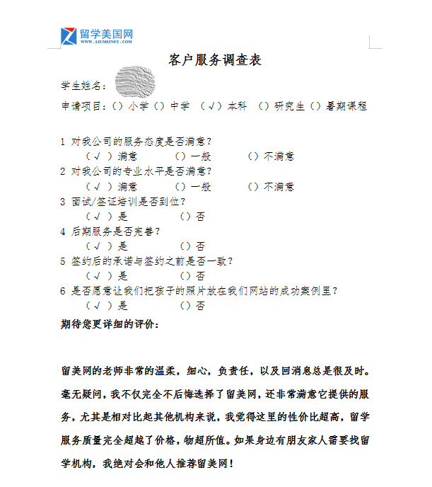 這是一份來(lái)自圣安塞姆男校學(xué)生家長(zhǎng)的一份調(diào)查反饋,在這一張簡(jiǎn)簡(jiǎn)單單的調(diào)查反饋背后凝結(jié)著留學(xué)美國(guó)網(wǎng)團(tuán)隊(duì)與家長(zhǎng)的無(wú)數(shù)心血,最終讓Z學(xué)生成功申請(qǐng)到了圣安塞姆男校。前往-圣安塞姆男校錄取展示