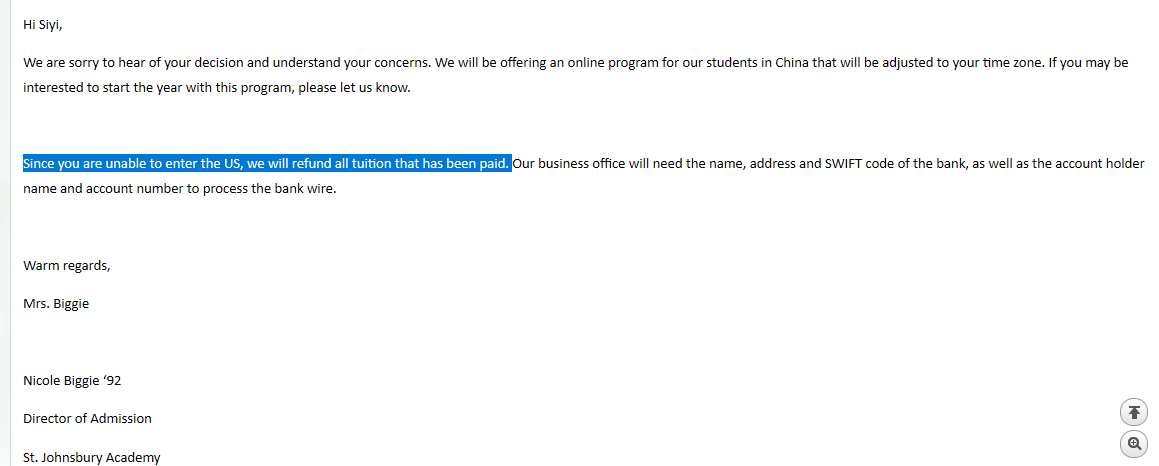 該校的聲明表示如果學(xué)生因?yàn)椴荒苋刖趁绹瑢W(xué)校不光可以退學(xué)費(fèi),甚至連大部分美高都不會(huì)給退的訂金都可以退!