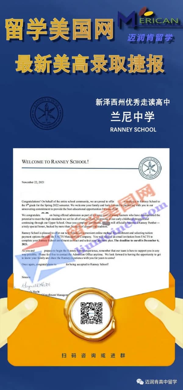 祝賀留美網(wǎng)H同學(xué)成功收獲Ranney School錄取
