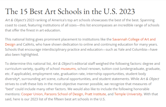 針對藝術(shù)學院和綜合大學中的藝術(shù)學院,以藝術(shù)領域和相關(guān)專業(yè)的學位和課程多樣性、學校聲譽、學費、就業(yè)率、畢業(yè)率、實習機會等因素列為參考依據(jù),Art&Object發(fā)布了2023年美國藝術(shù)大學排名榜,除了薩凡納藝術(shù)設計學院、羅德島設計學院等藝術(shù)院校,耶魯、哥倫比亞大學等綜合院校也實力上榜!