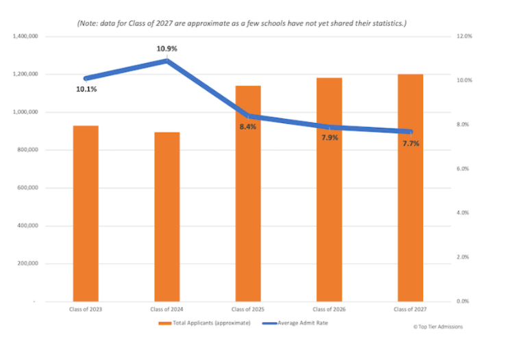 整體來看,申請人次達(dá)到了120萬,錄取率僅為7.7%,再創(chuàng)歷史新低。