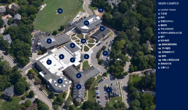 學(xué)校位于羅利市中心,占地32英畝,擁有餐廳,大面積的體育場(包括足球場、曲棍球場、網(wǎng)球場、棒球場等)、健身房,教學(xué)樓、表演藝術(shù)中心,萬圣堂(教堂)、還有法魯克·布塞索紀念花園,設(shè)施現(xiàn)代齊備。