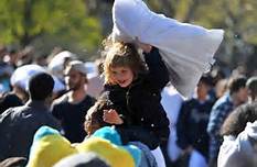 6日當天艷陽高照,所有來到華盛頓廣場的人們都隨身攜帶著各種樣式形狀的枕頭,有的參與者為了避免在打鬧中受傷,更是戴上了頭盔,準備迎戰(zhàn)。隨著一聲開始令下,現(xiàn)場立刻陷入了一場混戰(zhàn),只見成百上千的枕頭在空中飛舞,人們互相拍打著素不相識的陌生人,以求娛樂和釋放壓力。其中也有不少傷者,縱使擦著鼻血,也要繼續(xù)的打鬧。
