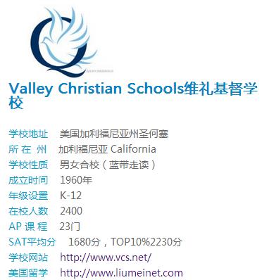 Valley Christian Schools維禮基督學(xué)校是一所位于美國圣何塞地區(qū)的私立走讀高中,招收K-12年級的學(xué)生。2013年最新藍帶高中評比中,學(xué)校再次獲得此殊榮。山谷基督教學(xué)校的使命是提供培育環(huán)境提供高質(zhì)量的教育支持奠定了堅實的基礎(chǔ)基督教價值觀與父母合作,裝備學(xué)生成為領(lǐng)導(dǎo)人侍奉上帝,為他們的家庭,和積極的影響他們的社區(qū)和世界。作為培育基督教學(xué)校,風(fēng)險尋求承認學(xué)生的父母誰將支持學(xué)校的使命,教育哲學(xué)。風(fēng)險投資,引導(dǎo)學(xué)生在權(quán)力下放的他們的父母和他們的各種地方教會。父母負責完成教育自己的孩子。