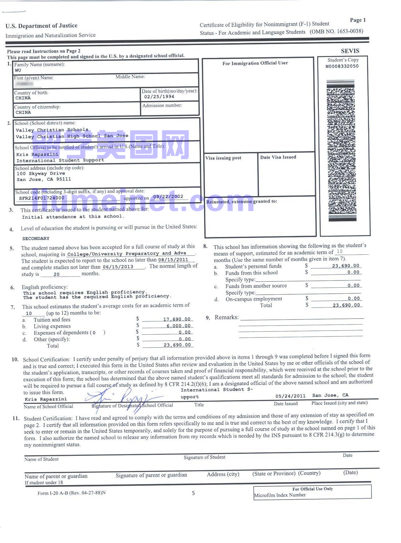 下面是我們一個去該校學(xué)生的I-20,目前該生已經(jīng)畢業(yè)并順利進入加州大學(xué)伯克利分校讀書。