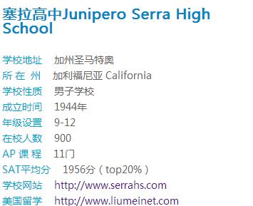 美國塞拉高中Junipero Serra High School是一所位于加州圣馬特奧的私立天主教大學(xué)預(yù)科的男子中學(xué)。學(xué)校成立于1944年,致力于給舊金山灣區(qū)的男孩們提供卓越的高中體驗。學(xué)校提供多門AP課程、榮譽課程和藝術(shù)類課程,塞拉高中的前20%的SAT平均分達(dá)到1956分,大學(xué)升學(xué)率為100%,學(xué)生多數(shù)升入常青藤名校等,畢業(yè)生的最低要求是符合加州大學(xué)體系或加州州立大學(xué)體系的要求。除了優(yōu)秀的學(xué)術(shù)之外,塞拉高中提供15種運動項目和38個課外活動俱樂部,給學(xué)生機(jī)會在各個方面充分展現(xiàn)自我風(fēng)采。塞拉高中和貝爾蒙特的圣母高中, 伯靈格姆的梅西高中一起展開三校聯(lián)盟合作。在塞拉高中,同學(xué)變成兄弟,老師變成導(dǎo)師,人生中平凡的瞬間變成了非凡的體驗。