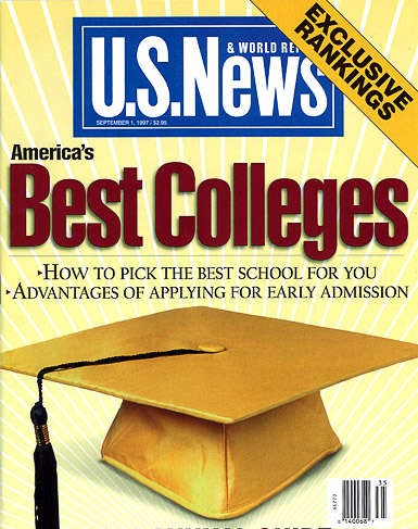 學(xué)生選拔性的排名是以三項(xiàng)指標(biāo)綜合后的得分來(lái)排定的。這三項(xiàng)指標(biāo)分別是被錄取學(xué)生的SAT或ACT的成績(jī)(占50%)、學(xué)生在高中的年級(jí)排名(占40%)和錄取率(占10%)。這里的學(xué)生全年級(jí)排名,在全國(guó)性大學(xué)和文理學(xué)院按前 10%,地區(qū)性碩士學(xué)位大學(xué)或綜合性學(xué)士學(xué)位學(xué)院按前25%計(jì)算。