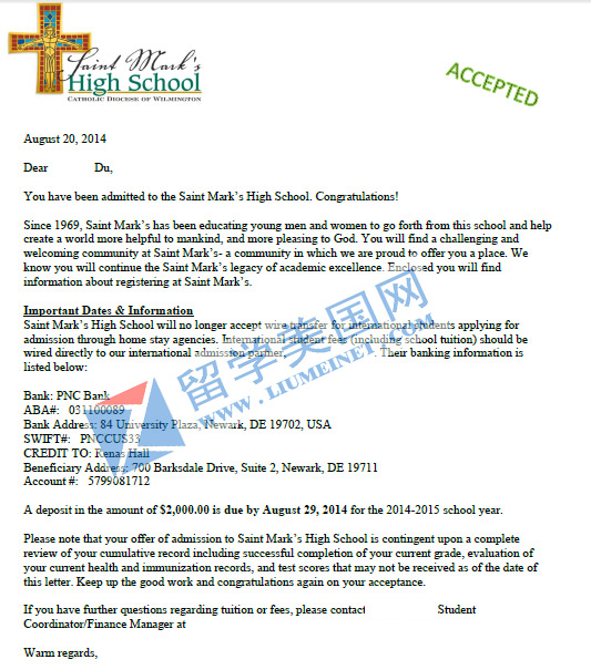 恭喜杜同學(xué)獲美國(guó)東部?jī)?yōu)質(zhì)高中圣馬可中學(xué)錄??!很榮幸,他是圣馬可中學(xué)秋季最后一個(gè)錄取的學(xué)生,也是是留學(xué)美國(guó)網(wǎng)為學(xué)生盡力爭(zhēng)取的!