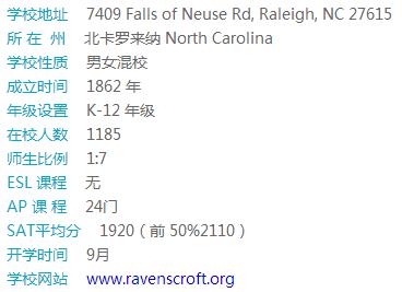 瑞文斯克羅夫特中學(xué)創(chuàng)立于 1862 年,是一所擁有 150 年的悠久歷史的名 校。校園面積廣闊,占地 125 英畝。該 校地理位置極佳,位于美國(guó)北卡羅蘭納 州首府 Raleigh。該校為北卡羅來(lái)納州 頂級(jí)名校高中,全美著名高中。150 年歷史,藍(lán)帶學(xué)校,學(xué)風(fēng)嚴(yán)謹(jǐn),充滿 學(xué)術(shù)氣息和多元化教育的優(yōu)質(zhì)學(xué)校 。