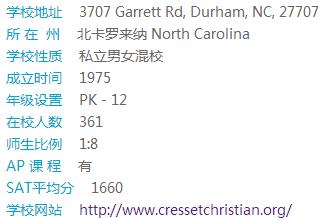 Cresset Christian Academy 成立于1975 年,是一所私立的基督學(xué)校,學(xué)校實(shí)行男女合校。學(xué)校開設(shè)大學(xué)預(yù)科課程、運(yùn)動(dòng)項(xiàng)目和藝術(shù)課程。學(xué)校是浸信會(huì)教友會(huì)的一員,并同教友會(huì)共同使用設(shè)施。學(xué)校致力于學(xué)生道德修養(yǎng)、自律能力、領(lǐng)導(dǎo)能力的提高,并培養(yǎng)學(xué)生養(yǎng)成良好的學(xué)習(xí)習(xí)慣,提供學(xué)生的計(jì)算機(jī)技能,教會(huì)學(xué)生用批判性思維看問(wèn)題,培養(yǎng)學(xué)生良好的世界觀。