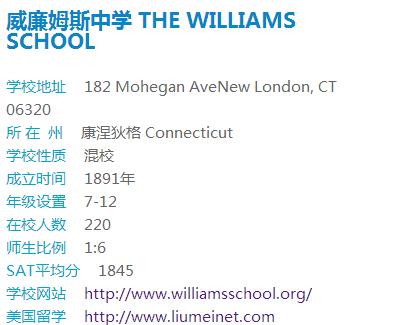 The Williams School 威廉姆斯中學(xué)有99%的學(xué)生畢業(yè)后進(jìn)入大學(xué)繼續(xù)深造,包括哈佛大學(xué)、杜克大學(xué)、約翰霍普金斯大學(xué)、波士頓學(xué)院、波士頓大學(xué)、哥侖比亞大學(xué)、喬治華盛頓大學(xué)、芝加哥大學(xué)等