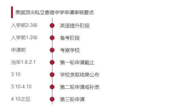 入學(xué)前2-3年英語提升階段入學(xué)前1-2年備考階段申請前考察學(xué)校當(dāng)年1.8-2.1第一輪申請截止3.10學(xué)校錄取結(jié)果公布3.10-4.10第二輪申請或補錄4.10之后第三輪申請