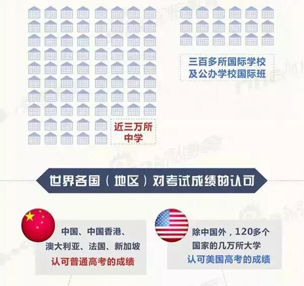 目前就中國的普通高考與美國高考相比,4個國家認可普通高考成績,學生的認可度稍顯弱并對之后的留學目的國選擇有所限制;相反,120多個國家的幾萬所大學認可美國高考的成績,可見,擁有美國高考成績的學生猶如有一張國家“通行證”。圖片數(shù)據(jù)來源新航道