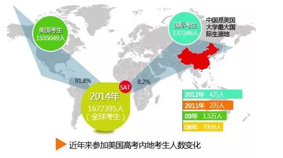 2015年,中國大陸高考人數(shù)是942萬,而2008年,這個數(shù)字是1050萬。與中國大陸高考人數(shù)下跌相比,SAT考試倒是越來越熱,甚至出現(xiàn)井噴狀態(tài)。SAT官方機構(gòu)美國大學(xué)委員會披露的數(shù)據(jù)顯示,來自大陸的考生2008年7000人、2009年1.5萬人、2011年2萬人、2012年激增至4萬人。2014年全球參加SAT的國際考生人數(shù)達到13.73萬人,這其中有一大部分為中國、韓國學(xué)生。