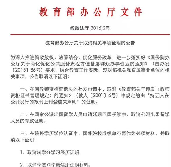7月11日,教育部辦公廳公布了《關(guān)于取消相關(guān)事項證明的公告》文件。文件公布了三大類證明被取消: