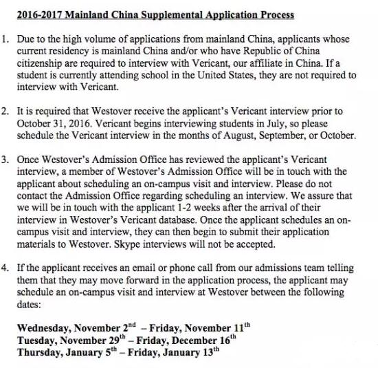 由于來(lái)自中國(guó)大陸的申請(qǐng)者過(guò)多,現(xiàn)在中國(guó)籍居住在中國(guó)大陸的學(xué)生申請(qǐng)必須通過(guò)維立克面試,如果學(xué)生已經(jīng)在美國(guó)就讀則可免維立克。