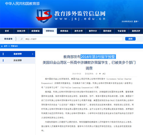 今天,教育部教育涉外監(jiān)管信息網(wǎng)發(fā)布2016年第3號(hào)留學(xué)預(yù)警。預(yù)警稱,美國舊金山灣區(qū)利佛山谷特許預(yù)科高中(Livermore Valley Charter Preparatory) 涉嫌欺詐我留學(xué)生,已被美多個(gè)部門調(diào)查。利佛山谷特許預(yù)科高中目前由當(dāng)?shù)匾患医逃?ldquo;三谷學(xué)習(xí)公司”(ThI-Valley Learning Corporation)代管。