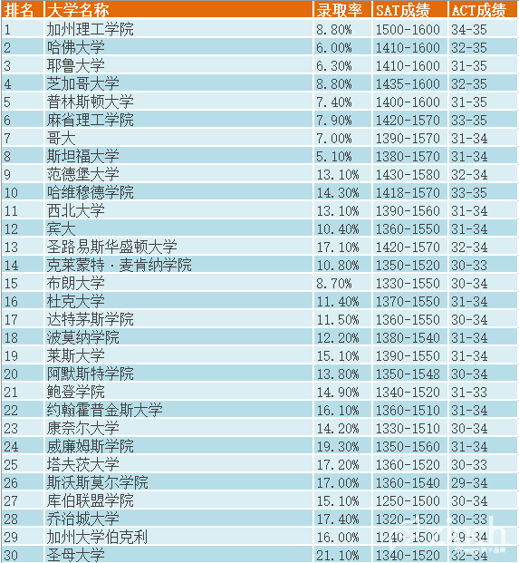 前不久Niche出了美國最佳大學(xué)排名TOP100的榜單,現(xiàn)在跟大家分享一下Niche2017年美國最難申請(qǐng)大學(xué)TOP100。除了最佳大學(xué)排名,Niche還根據(jù)錄取率、SAT/ACT成績的高低整理了2017最難申請(qǐng)的美國大學(xué)。錄取率權(quán)重占60%,錄取學(xué)生的SAT/ACT成績占40%。根據(jù)這份榜單,美國最難申的大學(xué)是加州理工學(xué)院。哈佛還比加州理工好進(jìn)些。