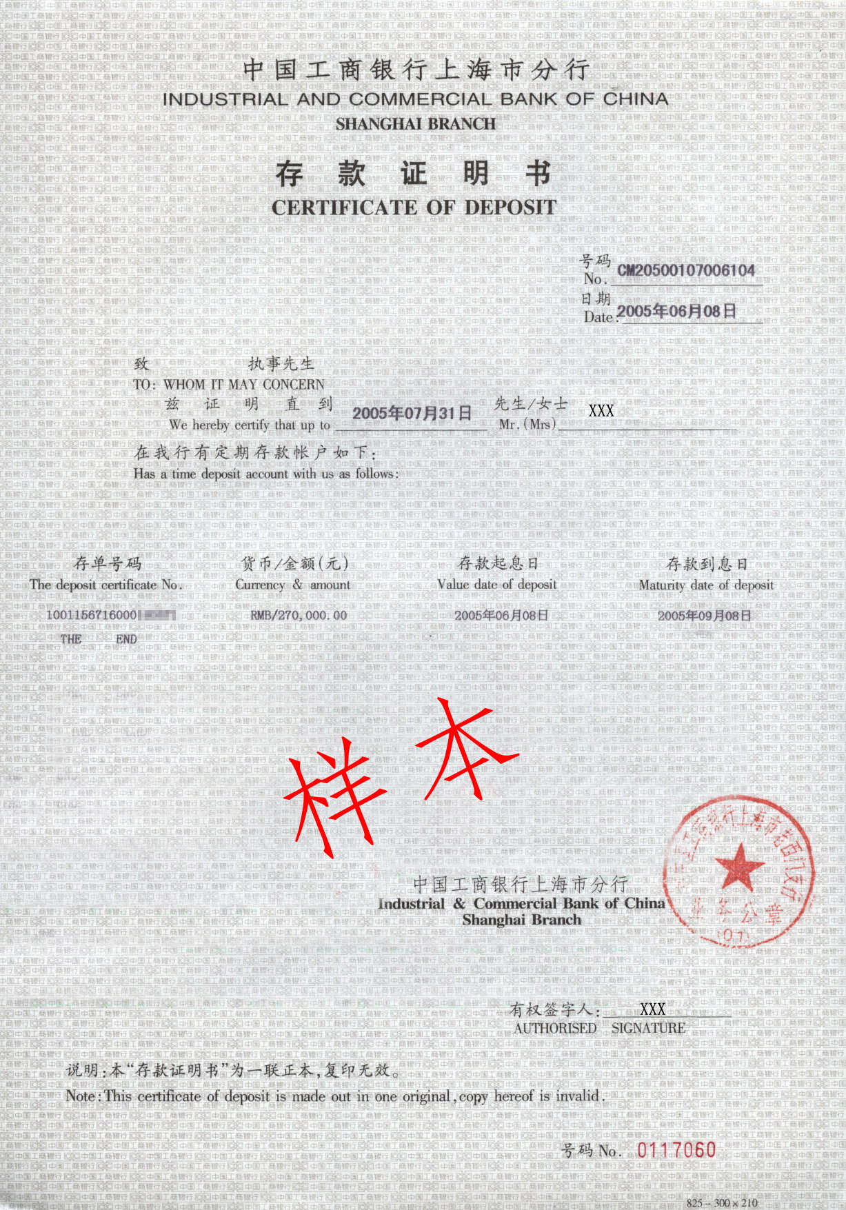 2、存款證明書上要有開具人的簽字,同時(shí)是中英文對(duì)照,戶主名字使用拼音。