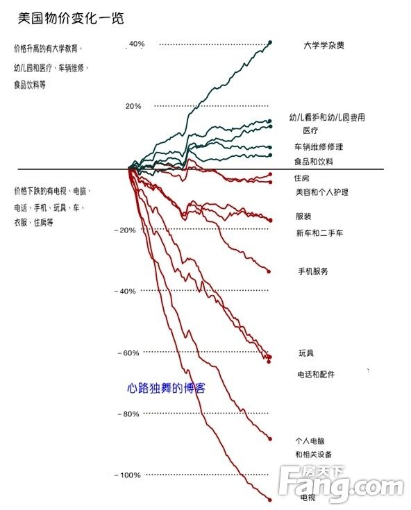 (4)食品、住房、美容美發(fā)等個人護理品的價格基本和通貨膨脹率持平。這里尤其值得注意的是住房,校正通貨膨脹率之后不僅沒有升值,反而略微有下降,再一次證實了我在以前文章中闡述的觀點,在美國炒房是不賺錢的。