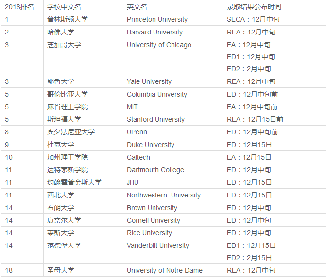 2018年TOP50美國大學(xué)ED/EA放榜時間