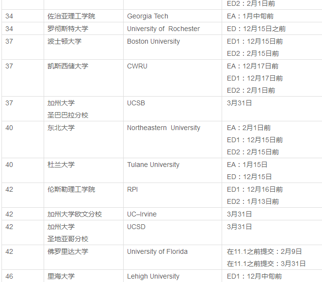 注:加州大學(xué)系是獨(dú)立的申請系統(tǒng),沒有EA、ED、RD之分,統(tǒng)一的申請截止日期為12月1日,這里也把放榜時間整合在這個列表里。