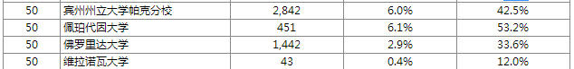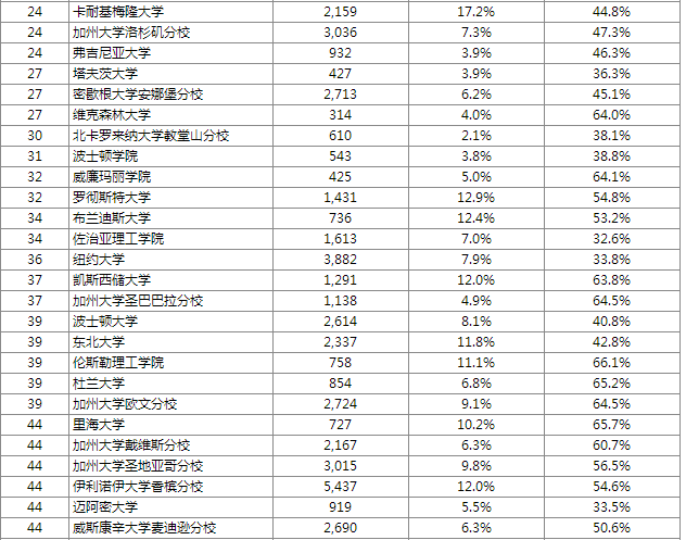 從表格可以看出,排名前五十的美國大學(xué)中,