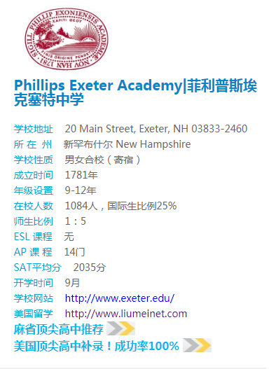 菲利普斯埃克塞特中學(xué)Phillips Exeter Academy是美國(guó)頂尖的寄宿中學(xué),學(xué)校旁邊就是商店,很便利,學(xué)校喜歡對(duì)知識(shí)有渴望的學(xué)生、擅長(zhǎng)交流和積極的聆聽學(xué)生,具有團(tuán)隊(duì)合作精神的學(xué)生、具有較好的組織管理和時(shí)間管理的學(xué)生、堅(jiān)強(qiáng)的性格學(xué)生。石老師也考察過(guò)這所學(xué)校,新SAT均分1430,學(xué)校提供450多門課程設(shè)計(jì)19個(gè)學(xué)科領(lǐng)域,提供20種運(yùn)動(dòng)項(xiàng)目,110種課外社團(tuán)活動(dòng),9種外文課程。升學(xué)率100%,升學(xué)走向非常棒,