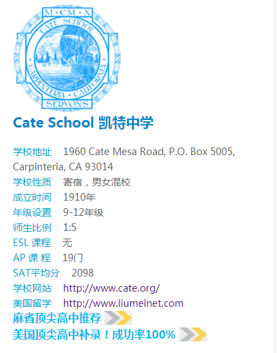 凱特中學(xué)創(chuàng)辦于1910年,是美國(guó)悠久傳統(tǒng)的男女合校中學(xué)之一,也是一所大學(xué)預(yù)備寄宿學(xué)校。2001年5月,被美國(guó)時(shí)報(bào)和世界新聞稱之為最著名的寄宿學(xué)校。學(xué)校校風(fēng)良好,教學(xué)品質(zhì)高,具有嚴(yán)格的教學(xué)標(biāo)準(zhǔn),并且很多的機(jī)會(huì)讓學(xué)生開展自己感興趣的課程。學(xué)校為學(xué)生提供了很多參與社會(huì)的機(jī)會(huì),讓他們幫助那些需要幫助的人。凱特中學(xué)位于加州的圣巴巴拉縣,距離太平洋只有一英里。Cate School坐落在山頂上,離海灘只有5分鐘,從學(xué)校的校園可以遠(yuǎn)眺美麗的太平洋。