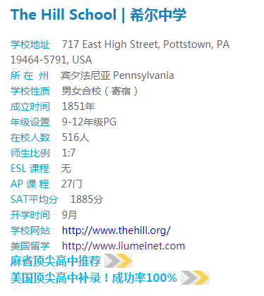 希爾中學(xué)The Hill School建立于1851年,是一所高教育質(zhì)量的男女混合學(xué)校。學(xué)校教學(xué)嚴(yán)謹(jǐn),課程強(qiáng)調(diào)批判性思考及寫作為學(xué)生提供了杰出的藝術(shù)教育課程,為學(xué)生將來(lái)考取美國(guó)著名大學(xué)以及將來(lái)事業(yè)的成功打下良好的基礎(chǔ)。學(xué)校課程強(qiáng)調(diào)批評(píng)性思維及寫作。學(xué)校對(duì)學(xué)生的期望是:有領(lǐng)導(dǎo)能力,有責(zé)任心以及謙恭有禮。