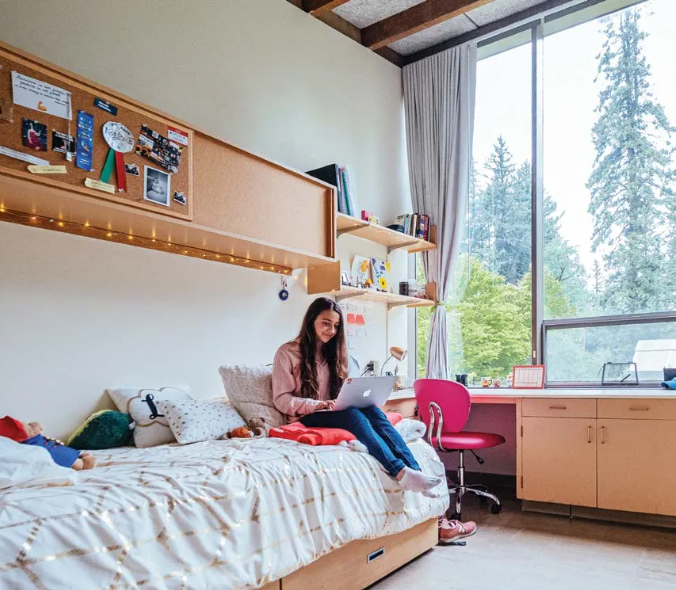 每個(gè)學(xué)生宿舍有一個(gè)洗手池,兩個(gè)帶儲(chǔ)物抽屜的桌子,兩個(gè)壁櫥,充足的儲(chǔ)物架,電話,無線上網(wǎng),和兩張床(XL床墊可用)。宿舍的公共空間包括帶壁爐和舒適座椅的休息室、自習(xí)室、廚房和洗衣設(shè)施。