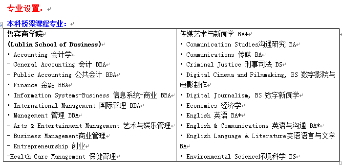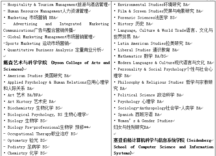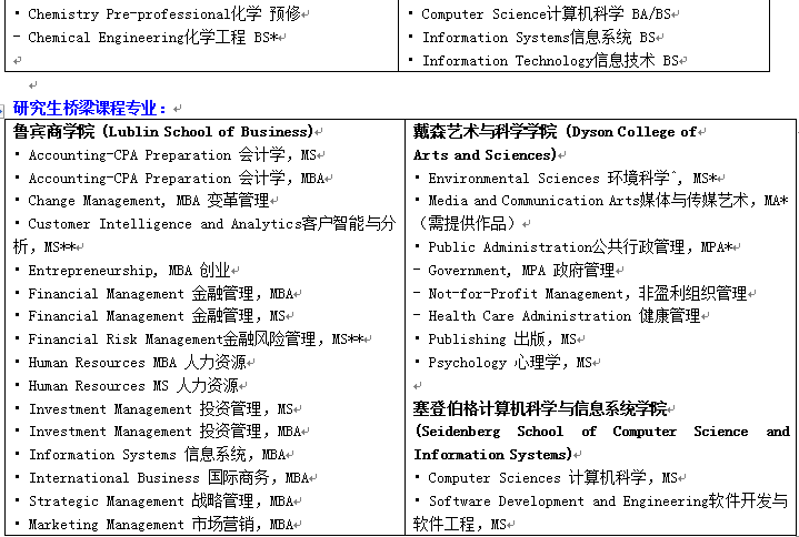 ² 佩斯大學(xué)與哥倫比亞大學(xué),紐約州立大學(xué),紐約醫(yī)學(xué)院以及紐約大學(xué)開設(shè)本碩連讀課程,在學(xué)生完成Junior Year前向各學(xué)院申請。總計五年內(nèi)可以獲得Master Degree;
