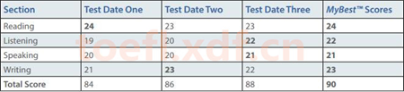 可以看出,這位考生最高的閱讀成績(jī)來自第一次考試,最高的寫作成績(jī)來自第二次考試,聽力和口語的最高成績(jī)來自第三次考試,于是這四者結(jié)合后這位托??忌钠捶殖煽?jī)?yōu)?0分。