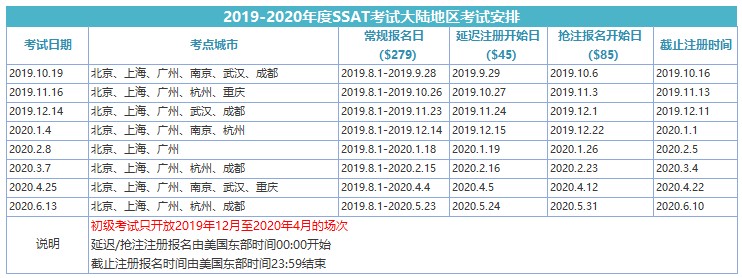 ssat考點及考試時間(2019-2020)