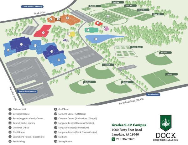 Dock Mennonite占地75英畝的校園建筑和景觀設計得像一所大學,分為距離5英里的兩個校區(qū),兩校區(qū)資源共享,其中高中校區(qū)占地40英畝。高中校區(qū)設施一流,現(xiàn)代化的教學設備:科學實驗室、計算機實驗室、化學教室、電子白板教學、1:1iPad教學、圖書館、表演廳、實驗室、健身房、運動場、音樂室、舞蹈練習室食堂、體育館、藝術廳、大禮堂、運動場等等一應俱全;還有各種最先進的視頻錄制編輯設備。滿足學生戶內、戶外學習與運動的所有需求。
