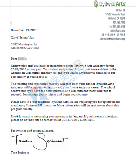 艾迪懷德藝術(shù)中學(xué)Idyllwild Arts Academy錄取offer展示: