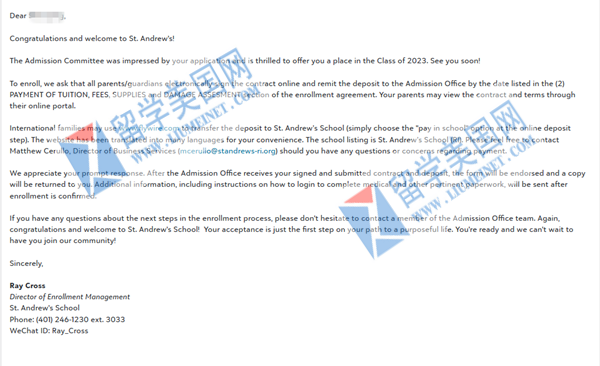 恭喜留學(xué)美國(guó)網(wǎng)C同學(xué)斬獲圣安德魯學(xué)校offer