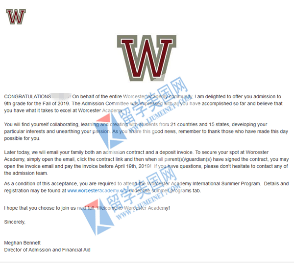 現(xiàn)在是激烈的美國高中補錄階段,學校名額一天三變。留學美國網(wǎng)拿到名額的第一時間,馬上與家長聯(lián)系,提交申請。當然,在此之前,留學美國網(wǎng)早已協(xié)助家長和同學,準備好了美高申請材料。每年留學美國網(wǎng)都有拿到好多補錄高中的offer,今年也一如往常,拿到了學校的offer。下面就是為大家?guī)淼奈樗固貙W院Worcester Academy offer。