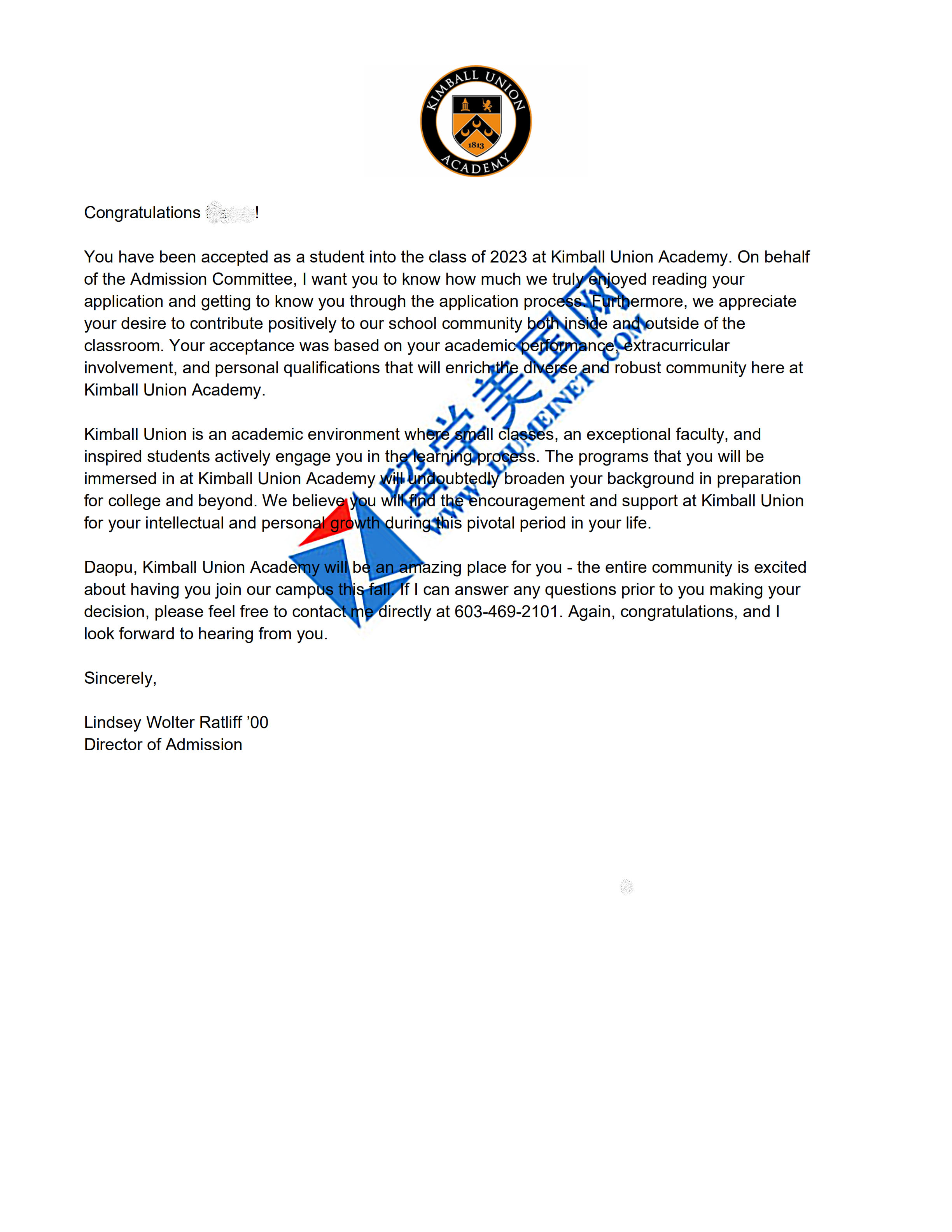 恭喜Z同學(xué)成功收獲金博聯(lián)合學(xué)院錄取offer(Kimball Union Academy)