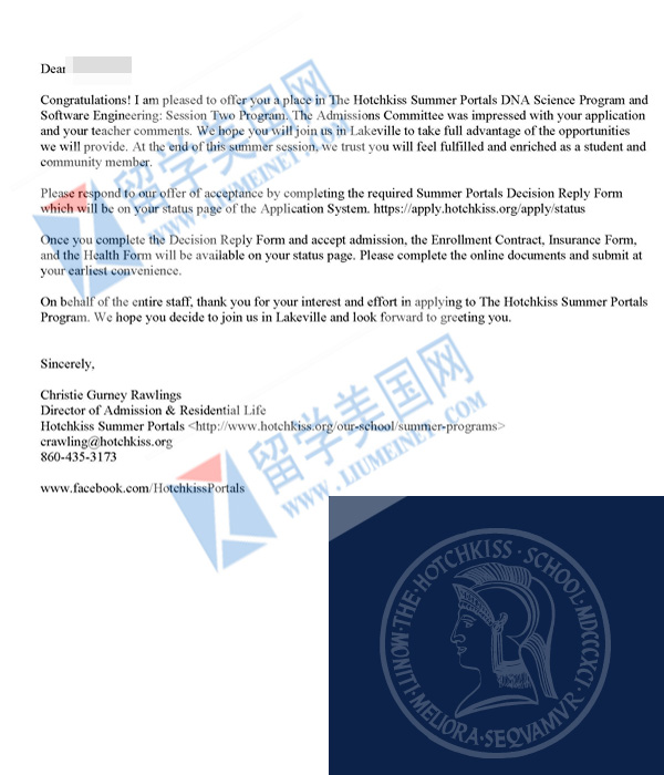 恭喜留美網(wǎng)Z同學(xué)獲得Hotchkiss School霍奇基斯offer