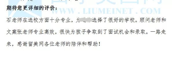 2019年已經(jīng)接近尾聲,但是美國高中招生春季、秋季招生卻在火熱進(jìn)行中,每當(dāng)看到每一位從留學(xué)美國網(wǎng)送出的學(xué)生都收獲了自己心儀學(xué)校的錄取,我們都感到非常的驕傲自豪。在今天這個(gè)特別的日子里,留美網(wǎng)非常感恩,也非常感謝每一位家長的信任、理解和配合,同時(shí)感謝每一位可愛而優(yōu)秀的學(xué)生們,你們的滿意才是我們值得榮耀和驕傲的事情。 帶著你們的信任,我們未來將會不斷的完善我們的專業(yè)、我們的服務(wù),為更多的家庭、更多的孩子申請到理想的學(xué)校,成就孩子的美好未來! 在服務(wù)家庭、學(xué)生的時(shí)候我們經(jīng)常會得到很多的反饋,而這些反饋則是我們通往成功途中一道靚麗的風(fēng)景線,下面就讓我們一起來傾聽吧。
