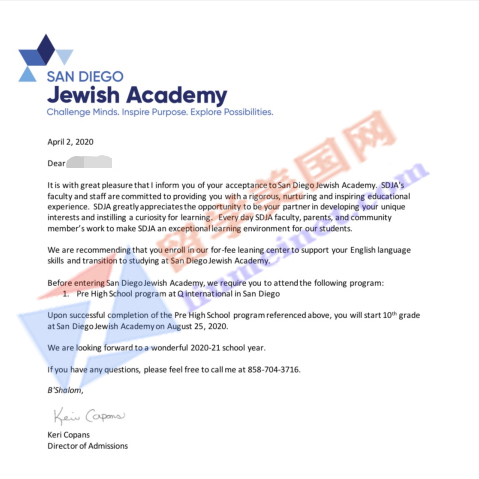 大家好!錄取捷報!在石老師帶領下,經過留美網團隊的共同努力,學生在成績很普通的情況下,幫D同學成功申請到San Diego Jewish Academy(圣迭戈猶太學院),恭喜留美網D同學!請見錄取offer展示!每一個Offer的背后都凝聚了留美網所有同事的共同努力,再次祝賀D同學!希望他在美國學業(yè)有成!同時感謝家長的配合和信任~