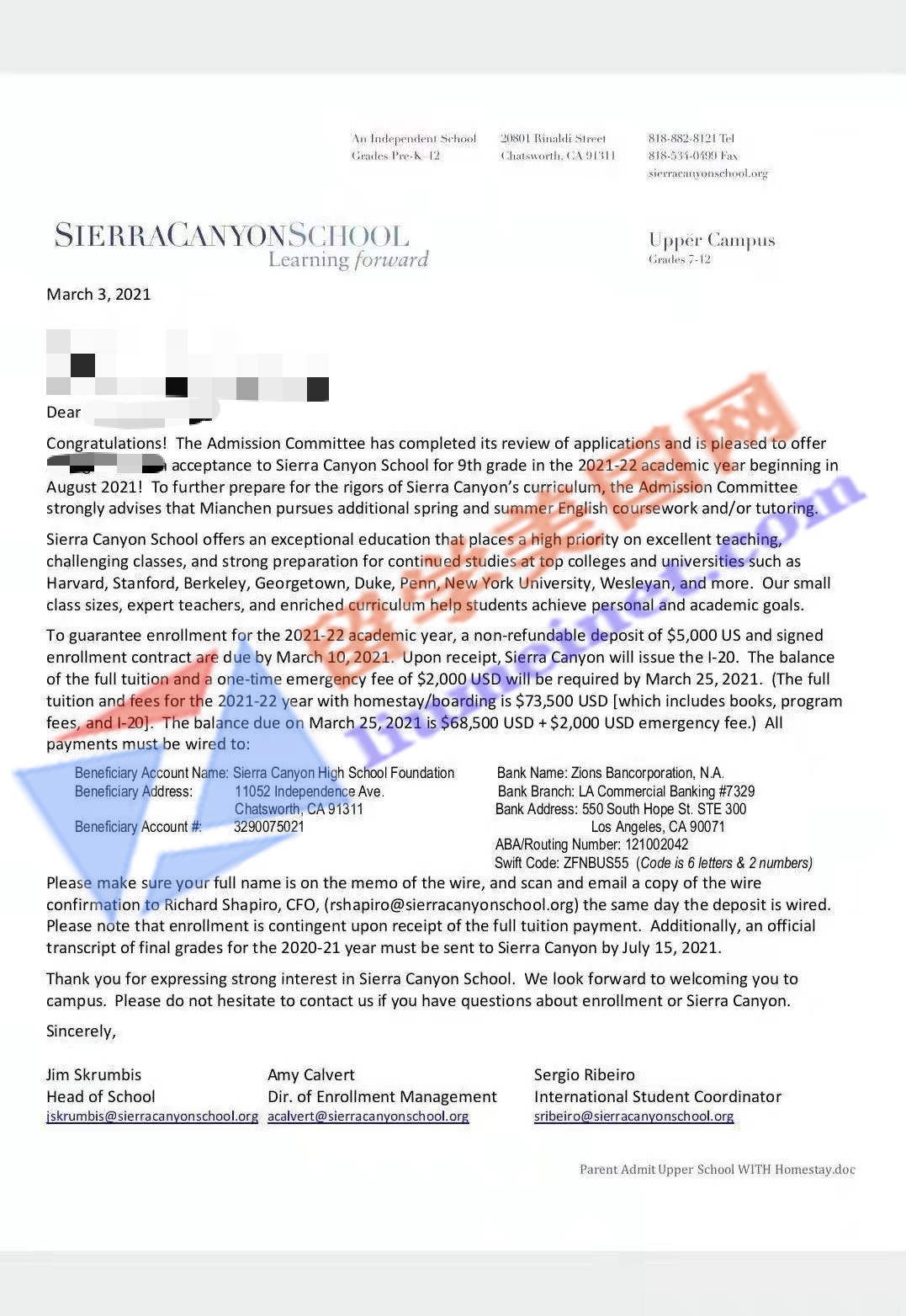 錄取捷報 | 恭喜留美網(wǎng)Z同學(xué)斬獲美國頂尖走讀高中塞拉峽谷高中Sierra Canyon School的錄取offer~