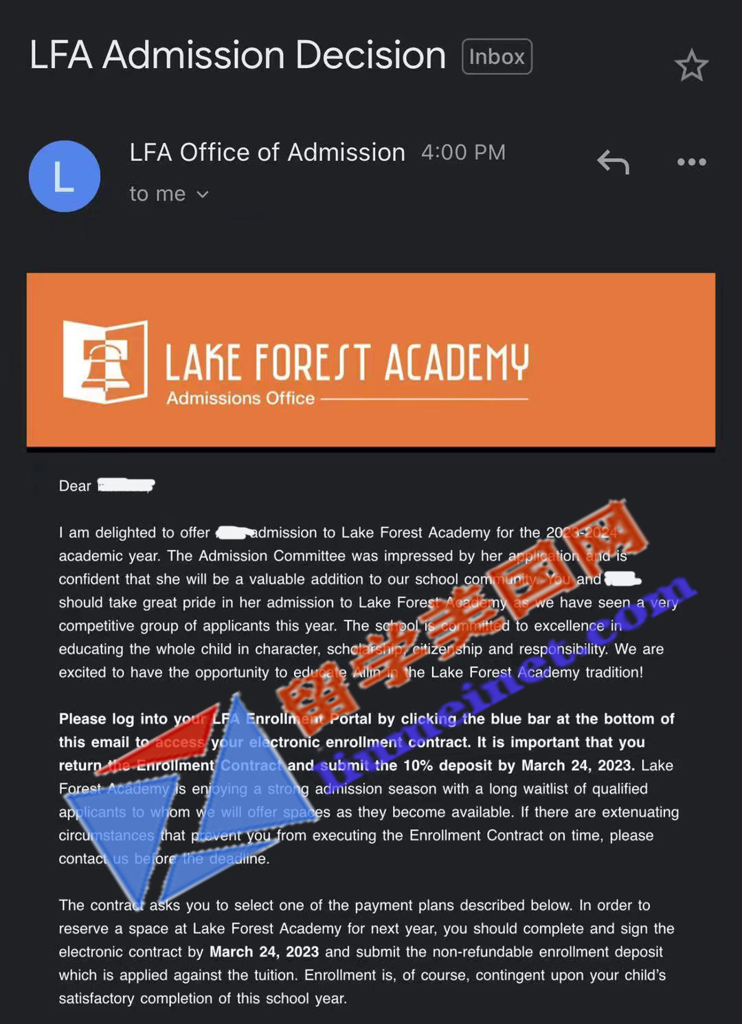 錄取喜報,恭喜留美網W同學斬獲湖森中學Lake Forest Academy錄取~