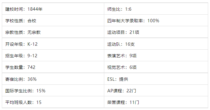 【地理位置】Kingston和Forty Fort位于賓夕法尼亞州東北部,距離紐約市以西2小時,距離費城以北2小時,離巴爾的摩、華盛頓特區(qū)和波士頓都不遠。 【學(xué)校設(shè)施】學(xué)校分為兩部分,高中校區(qū)有三塊人造草坪、三棟宿舍和五棟教學(xué)樓,周邊還有滑雪場等娛樂設(shè)施。 【學(xué)術(shù)強?!繎讯砻鞲咧袚碛袕娏Φ膶W(xué)術(shù)能力,是美國僅有的14所Round Square會員學(xué)校之一,也是賓州唯一的成員學(xué)校;學(xué)校注重教學(xué)質(zhì)量,自創(chuàng)建以來一直以“教學(xué)嚴謹、管理嚴格”著稱。 【藝術(shù)項目】藝術(shù)項目全面,有踢踏舞、芭蕾等舞蹈項目,還有視覺藝術(shù)和音樂課程。 【體育競技】該校的男子摔跤項目是全美著名的,曾經(jīng)貢獻多名藤校選手,該校冰球隊、曲棍球隊也是傳統(tǒng)強隊。 【課外活動】課外活動方面,學(xué)校的俱樂部是非常多的,學(xué)生可以根據(jù)興趣進行選擇。 【特色項目】該校的人文研究、STEM課程和氣候研究課程是比較突出的。 懷俄明高中建于1844年,是美國著名的百年貴族名校,也是美國東北部最古老的中學(xué)及大學(xué)預(yù)科學(xué)校。學(xué)校注重教學(xué)質(zhì)量,教學(xué)嚴謹是它的代名詞,同時學(xué)生可通過學(xué)校活潑的教學(xué),了解及欣賞藝術(shù)、音樂、科學(xué)及文學(xué),讓學(xué)生學(xué)會獨立自主、有責(zé)任心、學(xué)會合作、互相照顧、關(guān)心世界及尊重他人。 Wyoming Seminary有高中和初中兩個校區(qū),高中校區(qū)位于賓夕法尼亞州的金斯頓,校園內(nèi)有三塊人造草坪、三棟宿舍和五棟教學(xué)樓。在校園之外,當(dāng)?shù)貫橥讲铰眯泻突┨峁┝藠蕵穲鏊?,附近還有專業(yè)運動隊和大型音樂活動的設(shè)施。初中校區(qū)位于賓夕法尼亞州的Forty Fort。 懷俄明神學(xué)院上層學(xué)校位于賓夕法尼亞州的金斯敦,距離費城、紐約市、華盛頓特區(qū)和波士頓只有幾個小時的路程。學(xué)校所在地是賓夕法尼亞州東北部的懷俄明山谷,這里風(fēng)景如畫,被稱為“有心臟的山谷”。Wyoming Seminary是一所杰出的、具有前瞻性思維的獨立學(xué)校。通過課堂課程、課外活動和領(lǐng)導(dǎo)機會,為學(xué)前班到高中的學(xué)生實現(xiàn)個人發(fā)展。 榮譽課程:代數(shù)榮譽課、生物學(xué)榮譽、微積分榮譽、化學(xué)榮譽、中文榮譽、創(chuàng)新精神榮譽、法國榮譽、希臘語言與文化榮譽、拉丁語榮譽、物理學(xué)榮譽、西班牙榮譽 AP課程:美國研討會-AP英語、文學(xué)與AP美國歷史、AP生物學(xué)、AP微積分AB、AP微積分BC*、化學(xué)、AP計算機科學(xué)、*先修課程是AP微積分AB、AP英語語言與作文、AP環(huán)境科學(xué)、AP歐洲歷史、AP法語語言與文化、AP拉丁文、宏觀經(jīng)濟學(xué)、音樂理論、AP Precalculus(新)、大學(xué)先修物理課、AP西班牙語語言與文化、AP西班牙文學(xué)與文化、統(tǒng)計學(xué)、AP工作室藝術(shù)-設(shè)計、AP工作室藝術(shù)-繪畫、AP美國政府與政治、AP美國歷史、AP世界史 人文與全球研究項目:該項目為期四年,學(xué)生重點學(xué)習(xí)歷史、語言、文化和政治方面的知識,學(xué)生將在畢業(yè)的時候獲得人文和全球研究專業(yè)的證書。 STEM項目:該項目同樣是一個持續(xù)四年的項目,分為兩個部分。首先是通過課堂上的學(xué)術(shù)課程進行方向選擇,第二是為了配合學(xué)術(shù)課程考生在接下來需要通過獨立項目來完成特定學(xué)科的工作,制作一個作品集并且在最后一年完成相應(yīng)的頂點項目。 氣候與可持續(xù)發(fā)展項目:學(xué)生可以專注于研究未來氣候變化的科學(xué)、全球、經(jīng)濟和社會影響的體驗,內(nèi)容包括實地探查、研究和投資組合的發(fā)展,最終同樣需要整理成為一個頂點項目。 該校的藝術(shù)項目有爵士樂、芭蕾舞、現(xiàn)代舞、踢踏舞等舞種。音樂方面專注于聲樂和器樂,學(xué)生可以參加管弦樂團和爵士樂團。在戲劇表演方面該校有豐富的經(jīng)驗,除表演之外也可以學(xué)習(xí)布景、燈光、服裝等知識。視覺藝術(shù)方面有高級繪畫、人物畫、二維和三維設(shè)計、繪畫、版畫和兩門陶瓷課程。 秋季運動:越野男子大學(xué)代表隊、越野女子大學(xué)代表隊、曲棍球隊、足球代表隊、高爾夫大學(xué)代表隊、足球男子代表隊、女子足球隊、網(wǎng)球女子代表隊 冬季運動:籃球男子代表隊、籃球女子代表隊、冰球男子代表隊(預(yù)備隊)、游泳男子代表隊、游泳女子代表隊、摔跤男子代表隊、摔跤女子代表隊 春季運動:棒球隊、曲棍球男子代表隊、曲棍球-女子大學(xué)代表隊、劃船代表隊、壘球代表隊、網(wǎng)球男子代表隊 《懷俄明年鑒》、3D打印俱樂部、工匠俱樂部、亞洲文化俱樂部、航空俱樂部、烘焙俱樂部、圣經(jīng)俱樂部、男子棒球、男孩籃球、男子曲棍球、男子冰球、男子網(wǎng)球、男孩摔跤、商務(wù)俱樂部、象棋俱樂部、古典俱樂部、氣候科學(xué)和可持續(xù)性、越野、縱橫字謎俱樂部、舞蹈團、戲劇和藝術(shù)、工程俱樂部、環(huán)境俱樂部、電子競技俱樂部、曲棍球、女子籃球、女子曲棍球、女子壘球、女子足球、女子網(wǎng)球、女孩摔跤、歷史俱樂部、人文和全球研究集中、器樂、國際