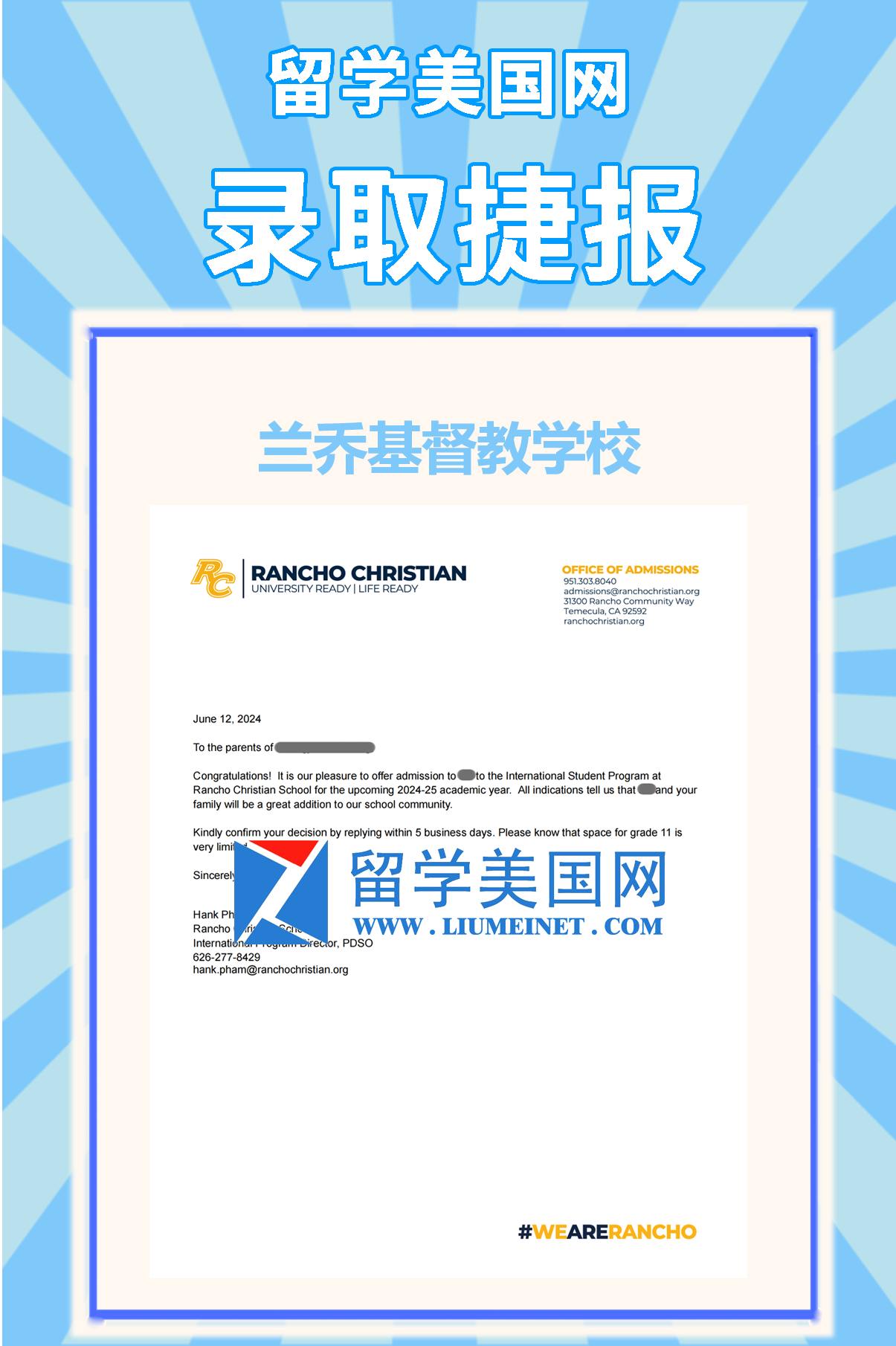 二、恭喜S同學(xué)獲得蘭喬基督教學(xué)校Rancho Christian School錄??!